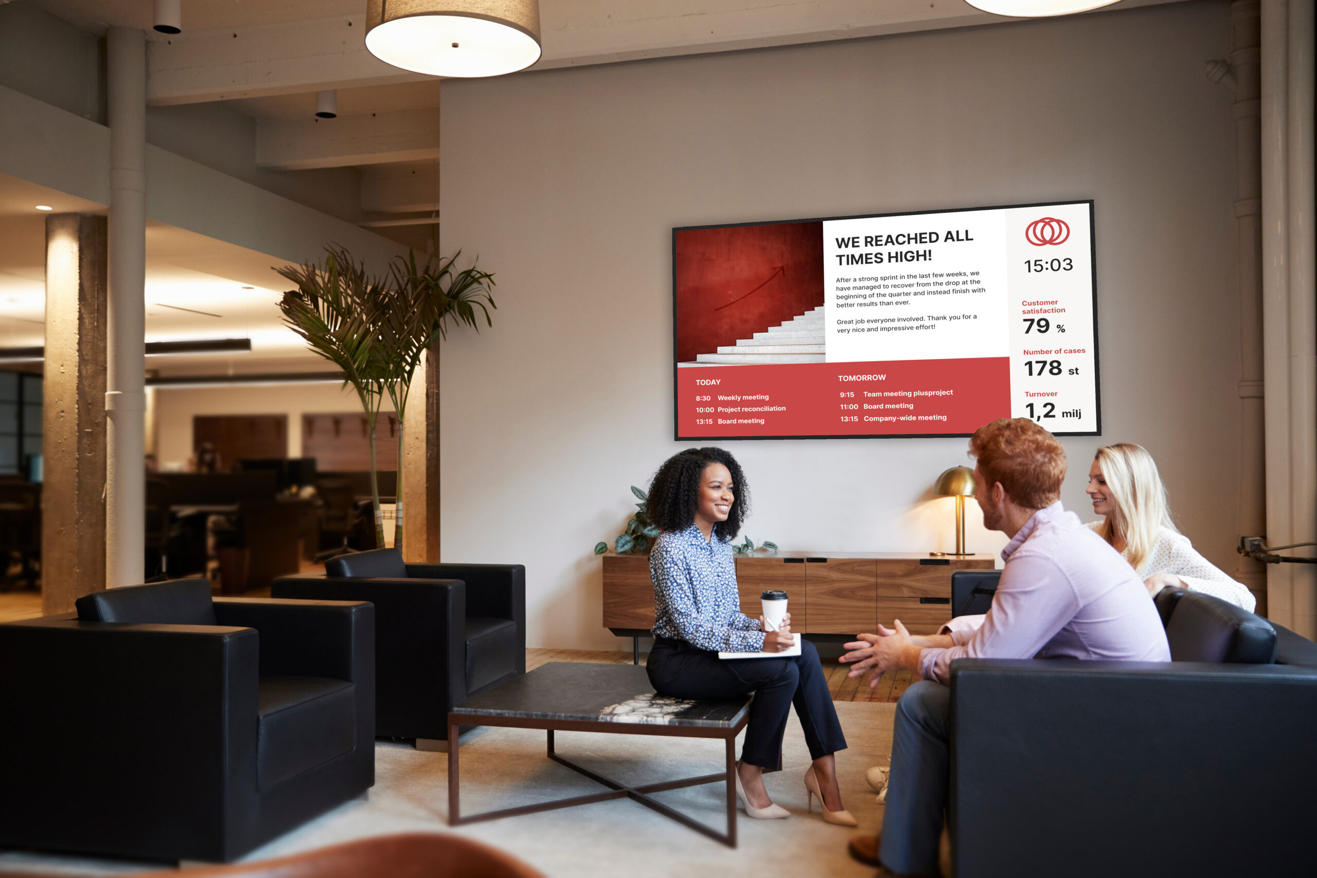 The data becomes more visible without requiring anyone to log in. It appears where people work, pause or gather. Always up to date. Always visible.
